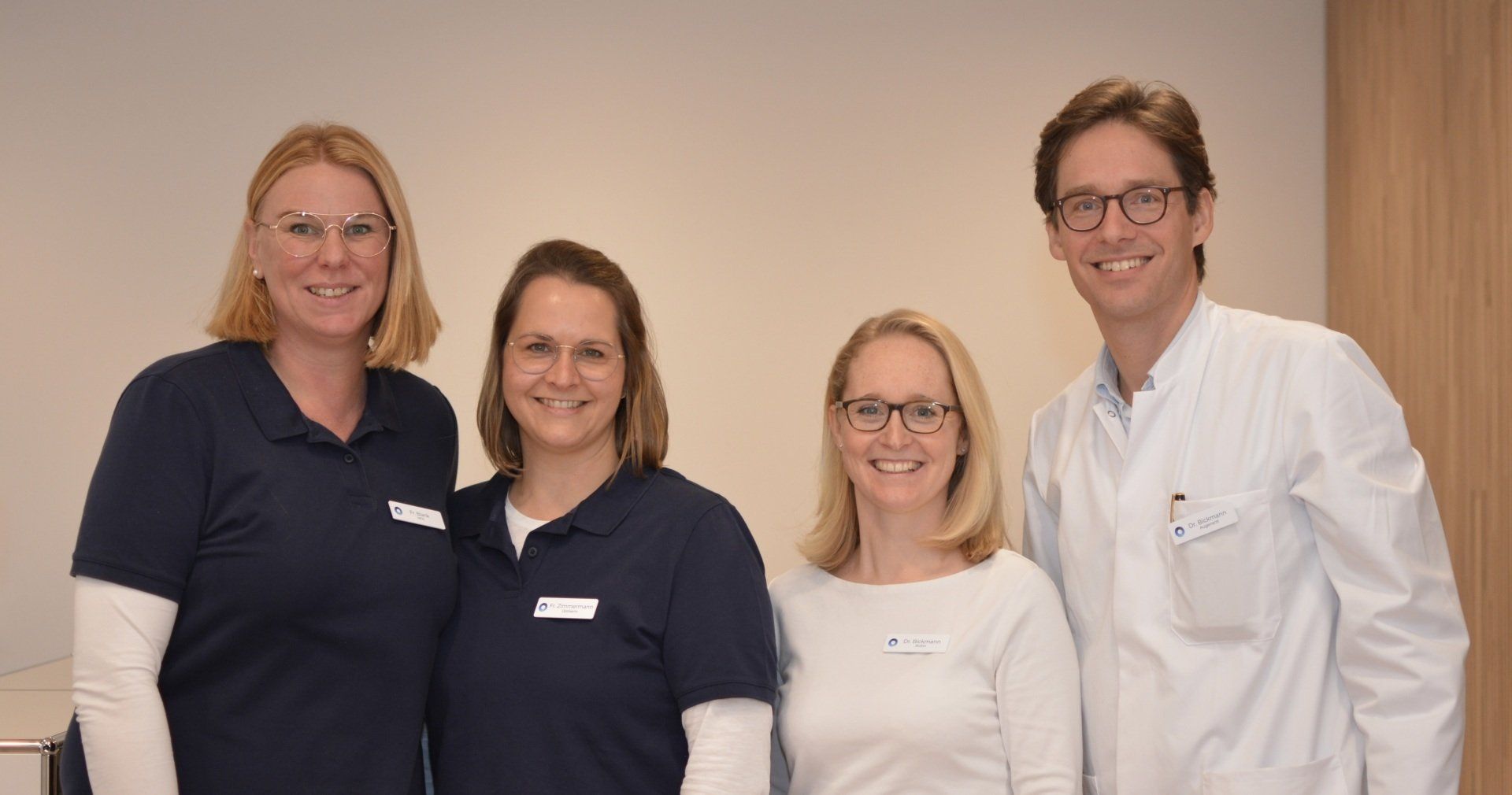 Team von links: Fr. Blank (MFA), Fr. Zimmermann (Optikerin), Fr. Dr. Bickmann (Ärztin), Hr. Dr. Bickmann (Augenarzt)